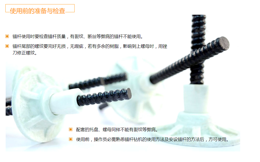 第二,玻璃鋼錨桿尾部的螺紋要完好無損,無瑕疵,如果有多余的樹脂要拿銼刀修正螺紋;
