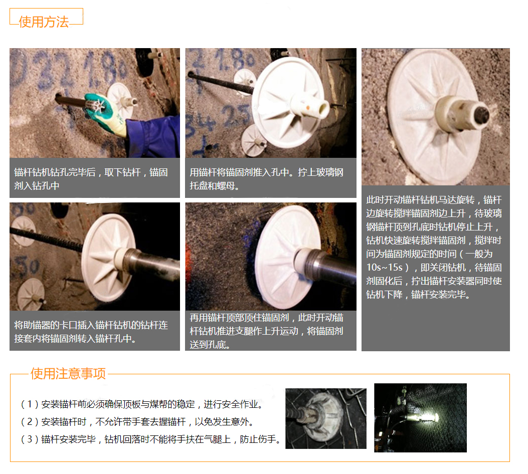 第五步:開動(dòng)馬達(dá)鉆機(jī)旋轉(zhuǎn),錨桿邊旋轉(zhuǎn)攪拌錨固劑邊上升,待玻璃鋼錨桿頂?shù)娇椎讜r(shí)鉆機(jī)停止上升,鉆機(jī)快速旋轉(zhuǎn)攪拌錨固劑,攪拌時(shí)間一般為10-15S,即關(guān)閉鉆機(jī),待錨固劑固化后,擰出錨桿安裝器,同時(shí)將鉆機(jī)下降,錨桿安裝完畢。