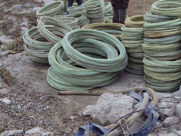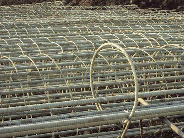 3、由于玻璃纖維樹脂筋材在生產(chǎn)時(shí)采用的是熱固性樹脂制作,成形之后在施工現(xiàn)場(chǎng)很難改變其形狀,為了保證玻璃纖維鋼筋籠的順利下放,可以利用10#(3.5㎜)鍍鋅鐵線將籠底的玻璃纖維主筋綁扎,起到收口的效果。